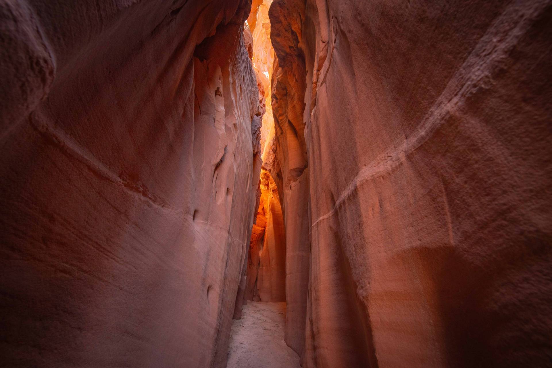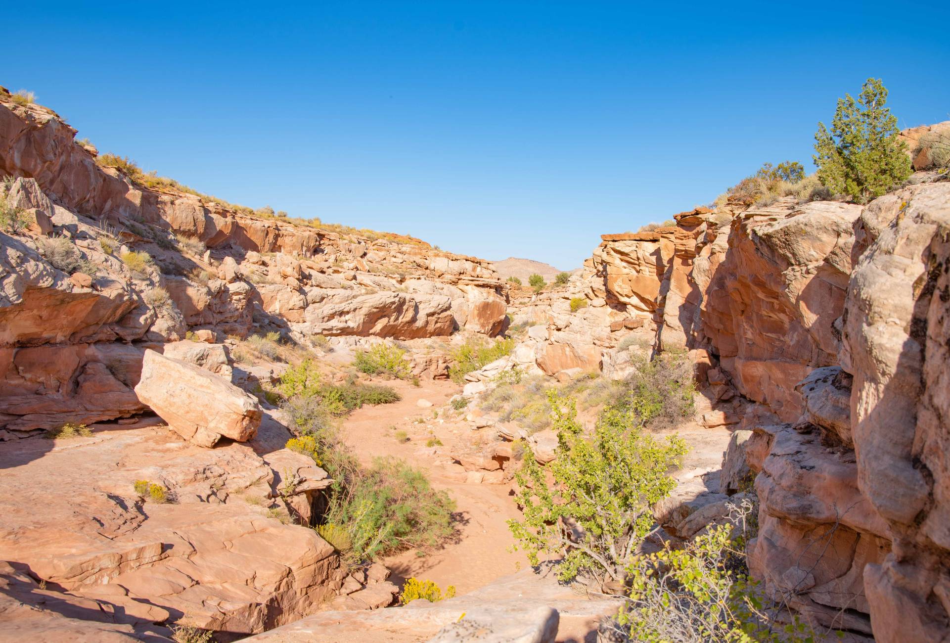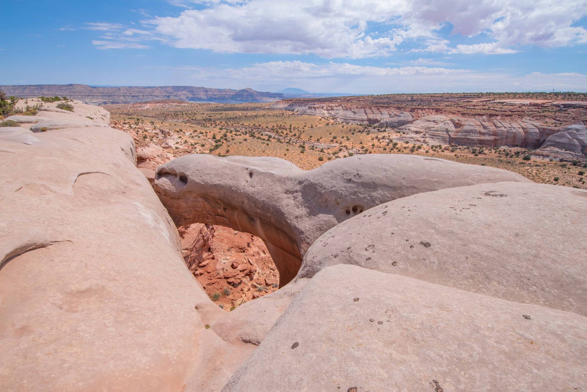 If you have an AWD vehicle (2WD not recommended), you can drive close to the rim where the arch is located. The last 150 yards of the two-track dirt road become faint and challenging to follow through juniper trees and sandstone cap rock. You won’t see the arch from the road, so you’ll need to get out and search for it. You’ll know you’re near when the road is closest to the canyon’s edge. The road veers left and climbs a sharp, rocky hill as you leave the arch area. To hike to the base of the arch and explore the mini slot canyons, head about 100 yards west from the arch to find a ramp that descends the ledges with some mild scrambling. For accessing the slots, it’s best to drop directly from the arch into the wash bottom rather than traversing the ledge up the canyon, as the ledge eventually cliffs out, requiring you to backtrack unless you can downclimb 5th-class terrain.
