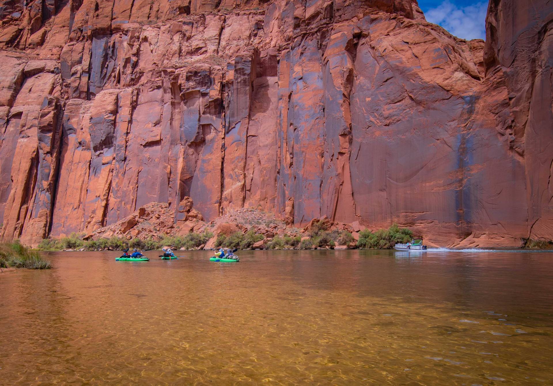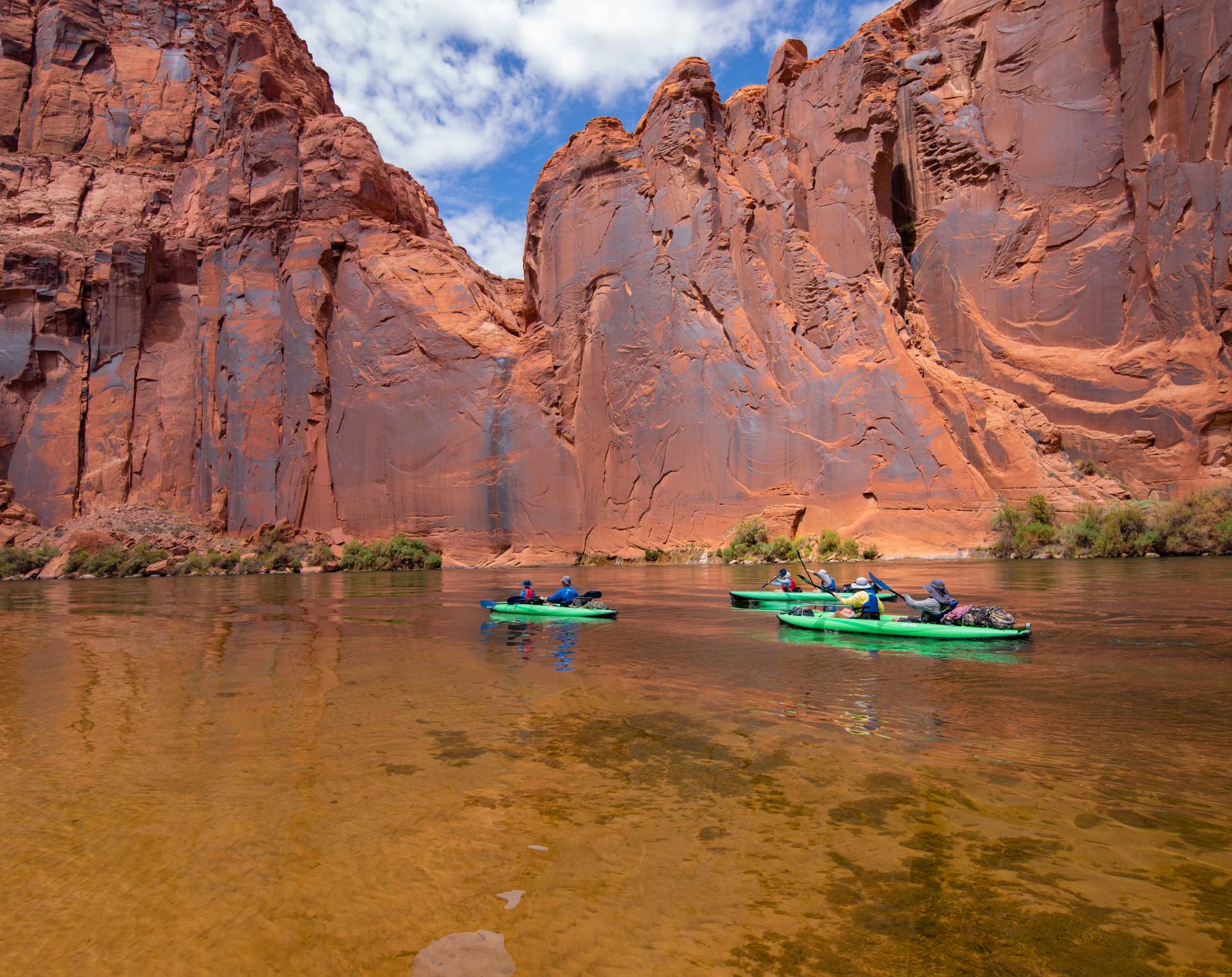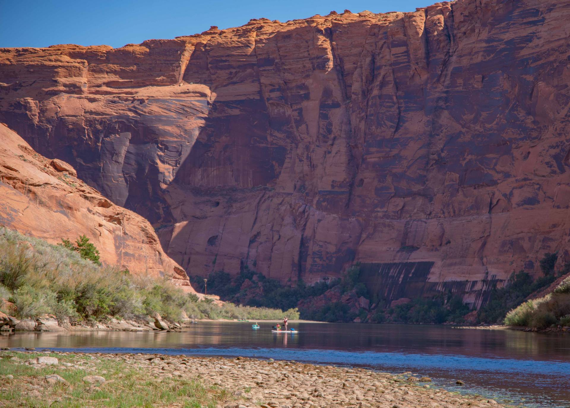 Paddling through Glen Canyon on the Colorado River is a must-experience for any paddler. The journey takes you through crystal-clear emerald waters, surrounded by towering sandstone cliffs and pristine shores that are truly unparalleled. As you float downstream, the serene current allows you to relax while observing an array of birdlife and the occasional Big Horn Sheep. Rainbow Trout dart beneath the surface, adding to the tranquil beauty of your adventure. The paddling is effortless, with no rapids or riffles to navigate, making it a leisurely and enjoyable experience.