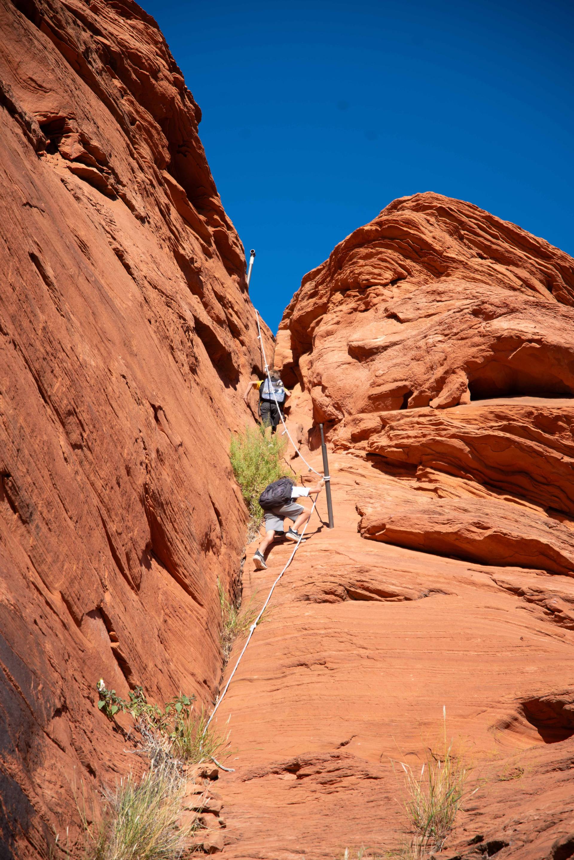 A couple hundred yards down some easy slick rock you will arrive at the crux of the route. A sixty foot slab of steep, slick sandstone protected by a hand rope. The 5th class moves are never really that hard but for those not used to heights and the slippery nature of the rock, this section can be intimidating. Most people don’t put their weight on the rope and let it slide through their hand as they climb the ledges with the grain of the rock, traversing down and in the upstream direction.