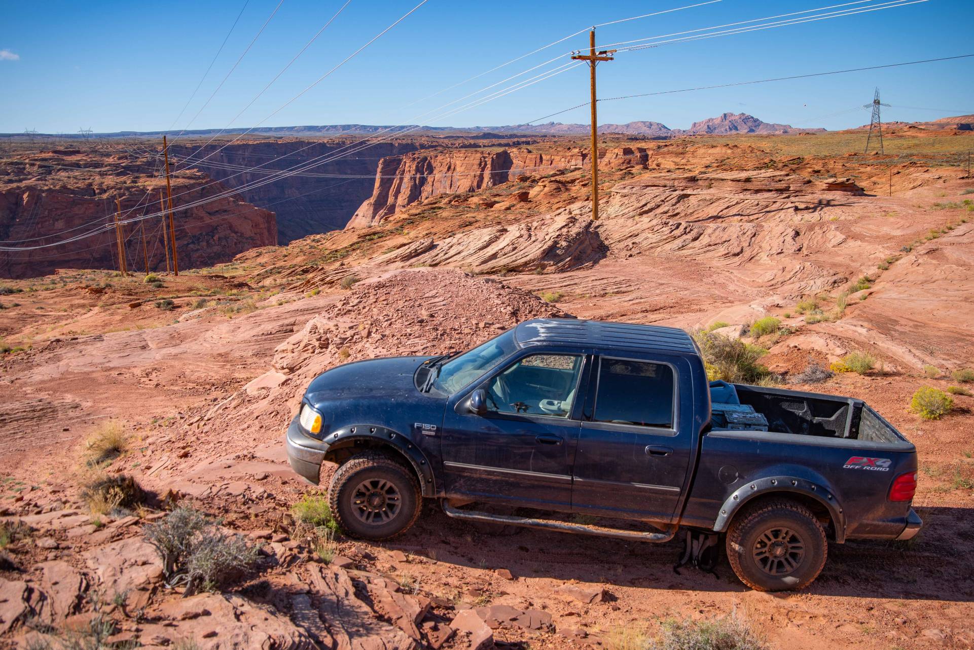 Take the dirt road past the Beehive Campground across from the Wahweap South Entrance and wrap around the Beehives (aka The New Wave) bearing left at the Ferry Swale/Dead Dog fork. Bounce over some sandstone washboard and then rally up a sand dune to a really cool amphitheater cavern. About a quarter mile past the cave you will take a left at a very soft, sandy intersection and then an immediate right towards the Electrical Substation. Keep the substation on your left and continue for another quarter of a mile. Park when you get to the edge of the sandstone escarpments on the same layer as the electrical transformers. There is a road that continues beyond but it is extreme and not worth the beating your vehicle will take.